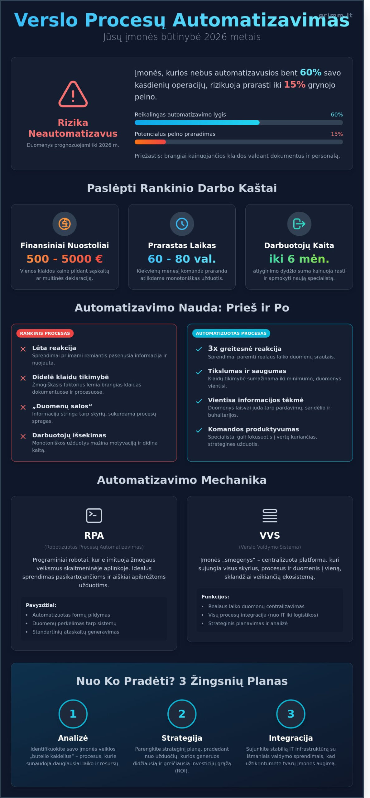 - Sužinokite, kodėl rankinis darbas 2026 m. tampa kritine verslo rizika ir kaip technologinė integracija padeda išvengti klaidų konkurencinėje rinkoje.