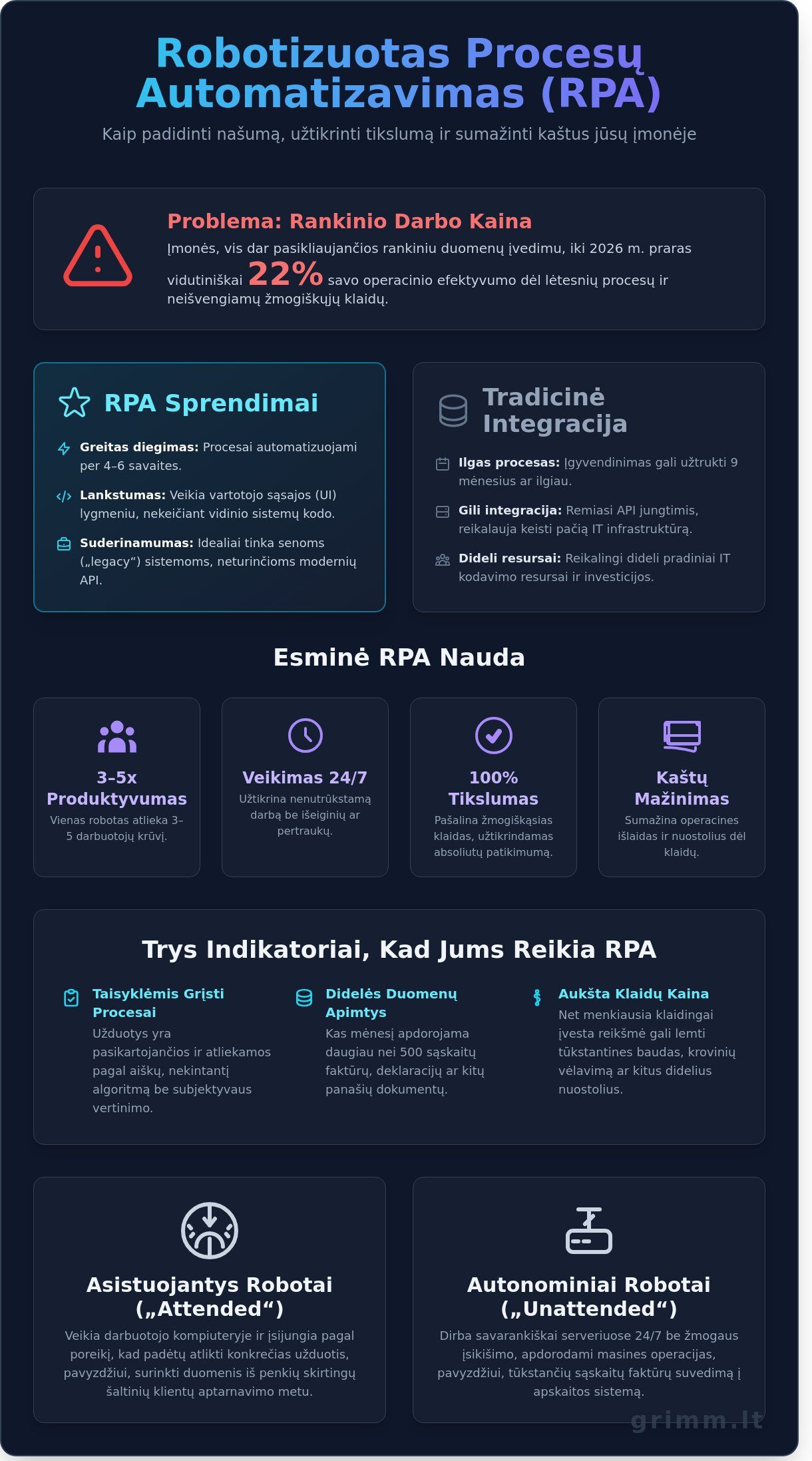 Robotizuotas procesų automatizavimas (rpa) 2026 metais tampa standartu, be kurio neįmanoma įsivaizduoti efektyvios logistikos ar gamybos grandinės. Remiantis sukaupta patirtimi, tinkamai įdiegtas RPA sprendimas kartu su mūsų sukurta GVS sistema gali padidinti operacijų greitį iki 35 proc. per pirmuosius 12 mėnesių. Sertifikuoti „Grimm“ IT infrastruktūros ekspertai nuo 2021 metų padeda įmonėms transformuoti sudėtingus, pasikartojančius procesus į sklandžiai veikiančius skaitmeninius algoritmus.